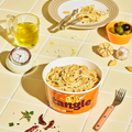 Pasta met knoflook- en oliesaus met suiker en zoetstof. Ingrediënten: Noedels 78,5 %: tarwebloem (gluten), gemodificeerd zetmeel (tapioca), soja-eiwit, kikkererwtenpoeder, tarwegluten, zout, zonnebloemolie (emulgatoren (E422, E322, E471), antioxidant (E306), bevat soja), zuurteregelaars (E501, E500, E339), tocoferololie (emulgatoren (E422, E475), antioxidant (E306), bevat soja). Vloeibare saus 12,8 %: smaakstof (bevat soja), suiker, kiparoma (bevat soja, tarwe, gluten, selderij), gistextract smaakmaker (smaakversterkers (E635, E620)), verdikkingsmiddel (E1420), knoflook smaakmaker (0,9 %) (smaakversterker (E635), bevat sesamzaad), plantaardige olie poeder (verdikkingsmiddelen (E1450, E415), zuurteregelaar (E341), antioxidant (E306), bevat soja), zout, sojasaus smaakmaker (smaakversterker (E635), bevat selderij), smaakversterker (E635), umami smaakmaker (zuurteregelaars (E296, E341)), olijfolie (0,1 %), krulpeterselie, zwarte peper smaakmaker (zuurteregelaar (E341), bevat soja), oregano poeder, chilipeperextract. Gearomatiseerde olie 6 %: olijfolie (4,5 %), sojaolie, groene thee smaakstof. Vlokken 2,7 %: gebakken knoflookvlokken (2,3 %) (knoflook, palmolie), chilipepervlokken. Allergenen: zie vetgedrukte ingrediënten. Kan schaaldieren, eieren, vis, pinda’s, melk, noten, mosterd en weekdieren